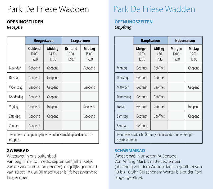Für Auskünfte steht Ihnen das Personal an der Rezeption zur Verfügung. Eventuelle Anpassungen der Öffnungszeiten finden Sie im Aushang am Rezeptionsgebäude.