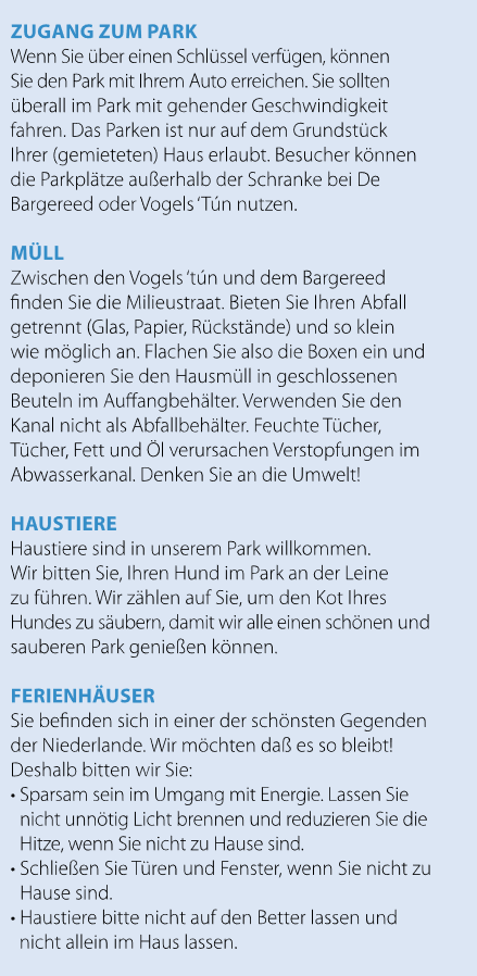 In der Regel können Sie ab 16:00 Uhr das Haus beziehen. Am Abreisetag sollte das Haus bis um 10:00 Uhr besenrein verlassen werden. Bitte hinterlassen Sie das Haus besenrein. Müll können Sie an der Müllstation ca. 50m vom Haus entfernt (Fußweg Richtung Rezeption) entsorgen. Den Schlüssel legen Sie bitte zurück in den Schlüsseltresor aus dem Sie ihn entnommen haben (bitte an das verstellen der Zahlenkombination zum schließen des Tresors denken).